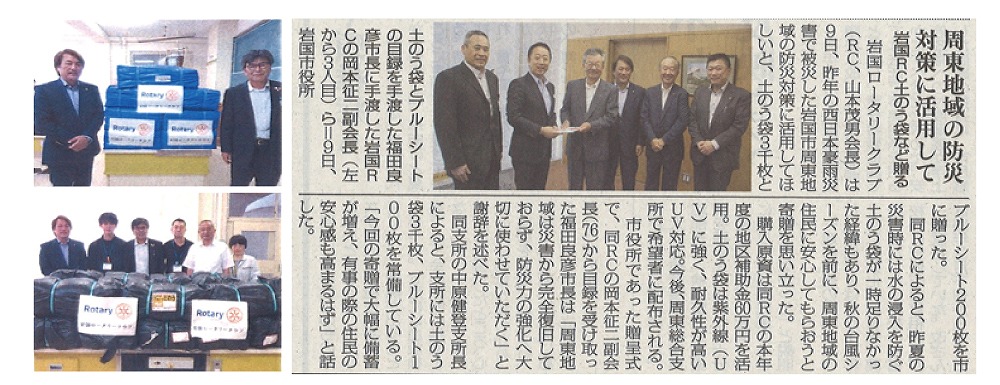 岩国市周東町における豪雨災害被災地支援のため、ブルーシート200枚と土嚢3,000枚を被災地の岩国市周東総合支所に支援する。