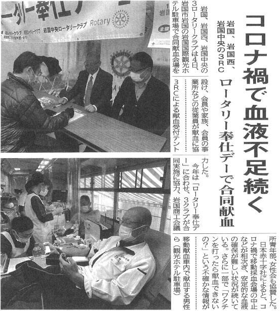 岩国3RC(岩国西、岩国中央、岩国)及び岩国商工会議所青年部、女性会と合同で「ロータリー奉仕デー」として献血活動を実施。