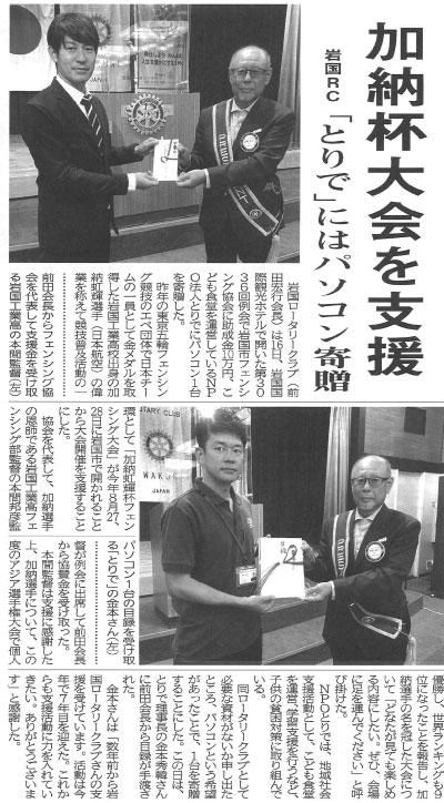岩国市のフェンシング競技普及活動の一環として開催される“加納虹輝杯 フェンシング大会”へ協賛し「岩国市フェンシング協会」へ助成金10万円を寄贈