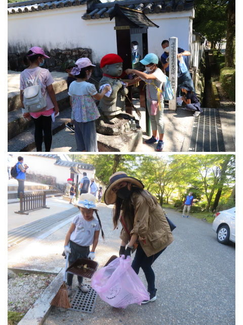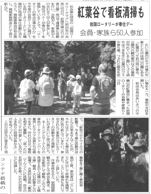 秋の親睦家族例会を開き、岩国市横山地区の紅葉谷公園周辺で清掃活動に汗を流しました。会員35人、家族15人が参加し、観光案内看板を雑巾で拭いたり、道路のゴミを拾ったりしました。